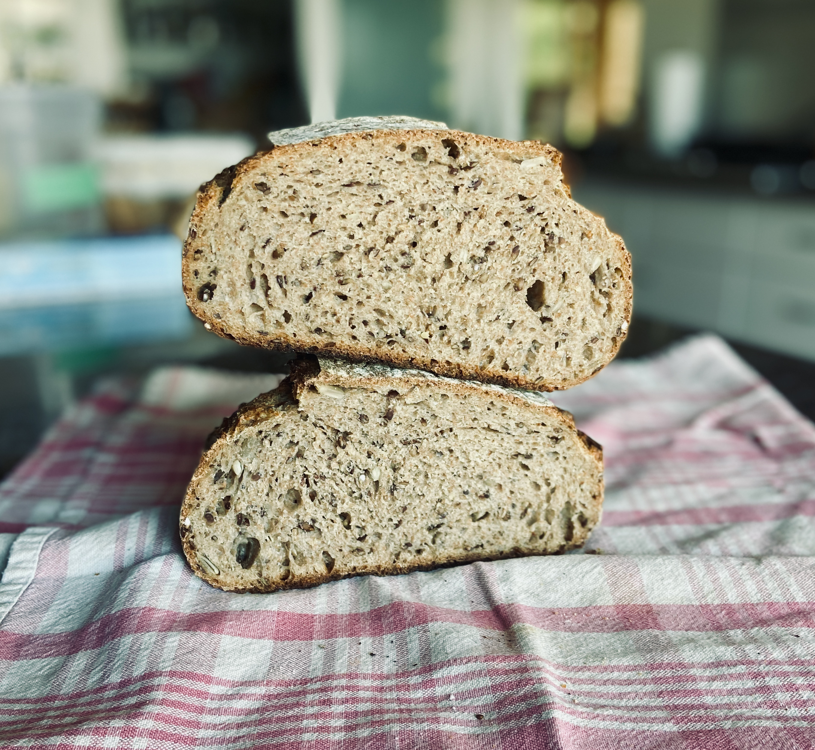 Here’s a good one! A luxurious bread with a beautiful nutty flavour and a pleasing texture. Not as dense as some seed bread, but seedy nevertheless. We call it Purple Barley Bread because its feature grain is just that: Ethiopian Purple Barley. It hails from Ontario, where it is grown by Against the Grain Farms, an organic “regenerative” grain operation that aims to renew the production and use of locally grown heritage grains. The barley is soaked overnight with a handful of flax and sunflower seeds to soften them before being mixed.